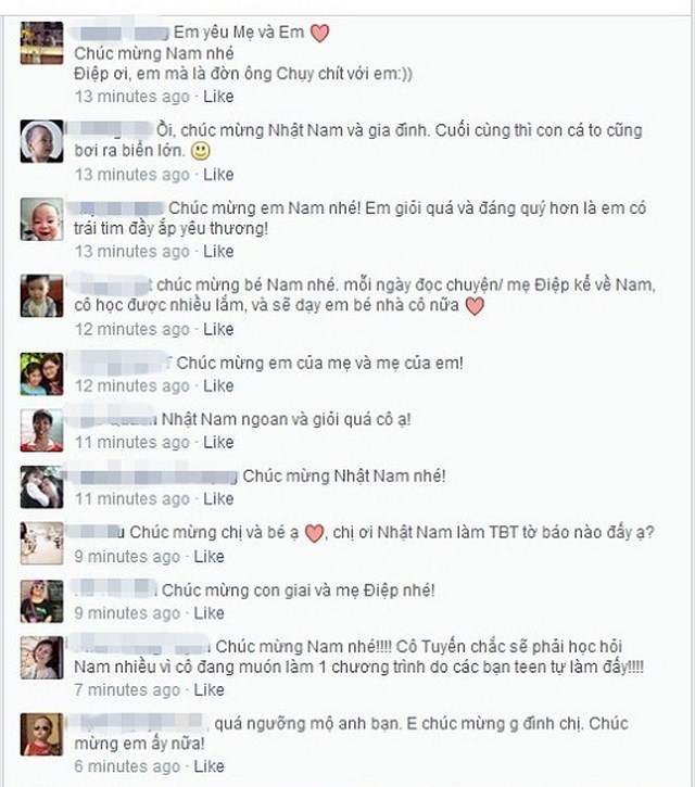 Rất nhiều bạn bè, người thân đã vào chia sẻ niềm vui cùng mẹ và bé Đỗ Nhật Nam. Nhiều comment thể hiện sự ngưỡng mộ và ước mong cậu bé sẽ tiếp tục đem trí tuệ của mình làm nên nhiều thay đổi tích cực cho xã hội, cộng đồng.