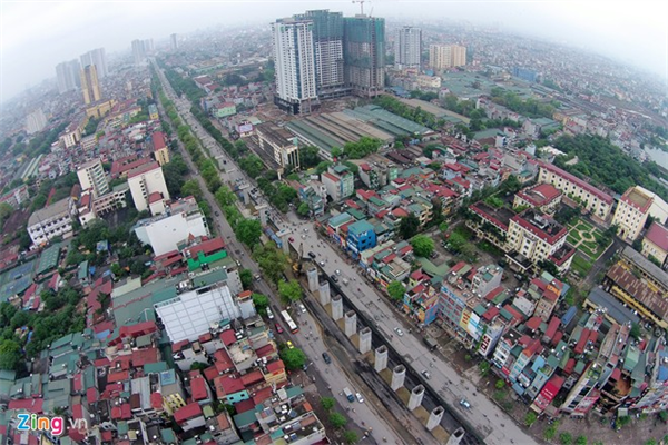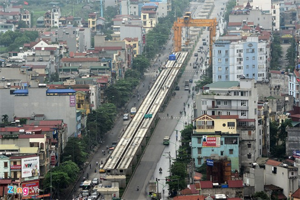 Trong ảnh, tuyến đường chạy dọc Nguyễn Trãi (Thanh Xuân). Từ ngày 3/4, nhà thầu dự án đường sắt trên cao tuyến Cát Linh – Hà Đông đã triển khai lắp dầm cầu. Sau 20 ngày thi công, 18 nhịp từ cột trụ JR08 đến cột trụ JR27 trên đường Quang Trung (Hà Đông) đã được ghép.