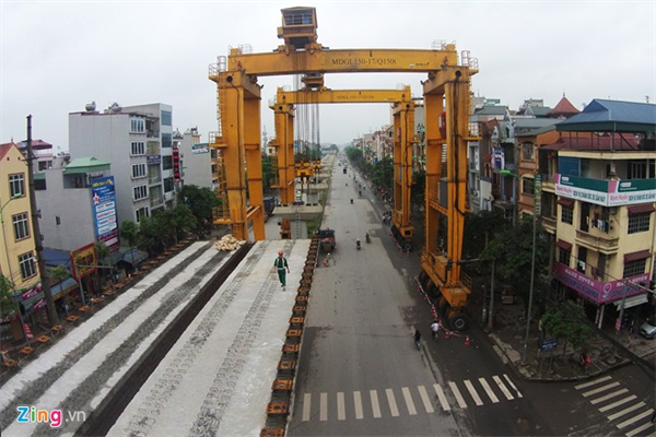 Cẩu trục khổng lồ lắp dầm đường tàu điện trên cao