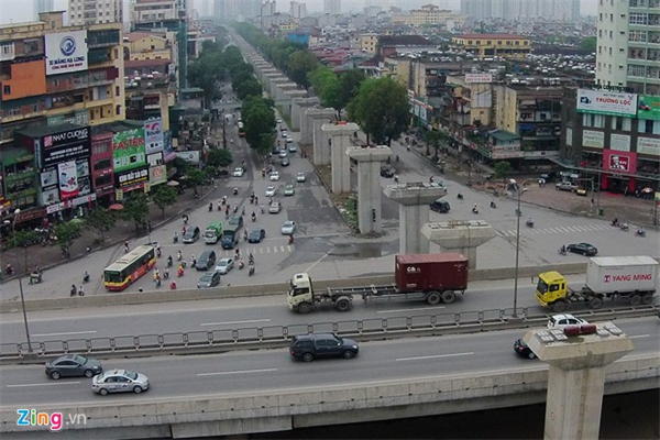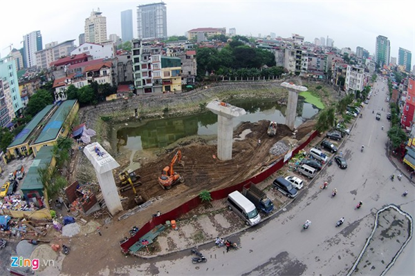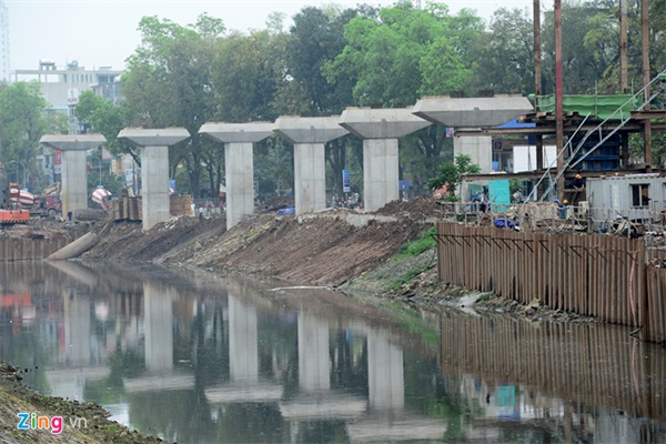 Những cột trụ bê tông khổng lồ mới mọc lên bên dòng sông Tô Lịch. Nếu đi ngược từ Hà Đông về trung tâm thủ đô, tuyến sẽ rẽ trái từ đường Nguyễn Trãi men theo sông Tô Lịch, sau đó rẽ phải vào phố Yên Lãng.