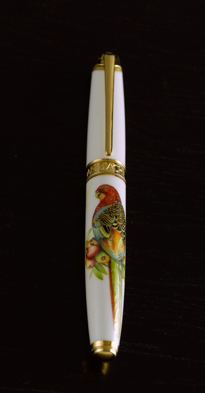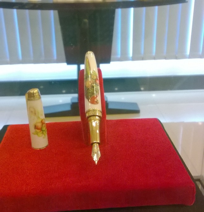 Cây bút đặc biệt này có vỏ bằng sứ viền vàng, hoa văn được vẽ thủ công và chìm sâu trong men, giúp bảo vệ tốt hơn. Dự kiến giá của cây bút được bán khoảng hơn 5.000 USD.