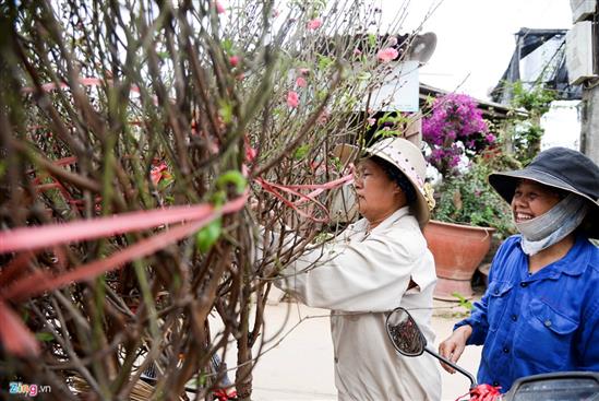 Thương lái đến mua những cành đào nở sớm với giá 50.000-70.000 đồng tại vườn Nhật Tân (Tây Hồ, Hà Nội).