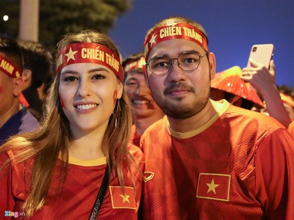 Nhiều cổ động viên ngoại quốc cũng mặc trang phục gắn cờ đỏ, sao vàng để cổ vũ cho đội tuyển của HLV Park Hang-seo. Trong ảnh là vợ chồng anh Kikri (Indonesia) và Eileen (Đức) đến sân. Anh Kikri cho biết mình yêu thích thủ môn Văn Lâm.