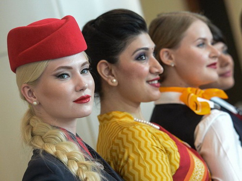 Dàn tiếp viên đọ sắc trong buổi trình diễn thời trang tiếp viên hàng không tại Sân bay Domodedovo.