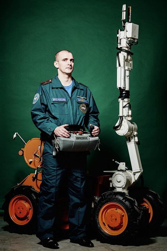 Alexey Shamin, 34 tuổi, chuyên gia vận hành robot cứu hộ, anh cho biết kỷ niệm đáng nhớ nhất là 28 tuần làm việc tại vùng Kursk, Nga để thu hồi khoảng 213 tấn thuốc trừ sâu và hóa chất. (Ảnh: Stoyan Vassev)