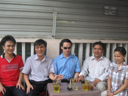 Anh Nguyễn Tuấn (thứ hai từ trái sang) và nhân viên tụ họp uống cà phê trước giờ