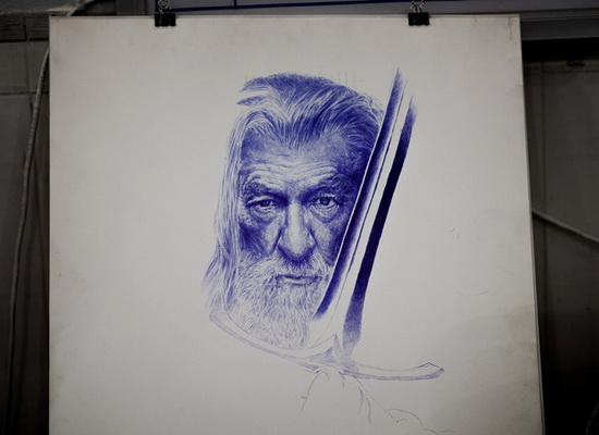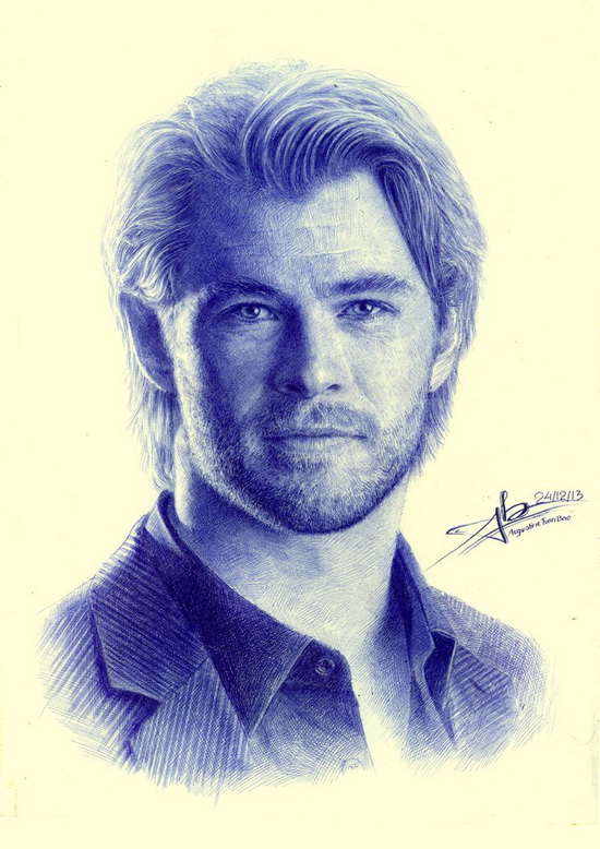Vẽ bút bi đòi hỏi tỉ mẩn và cẩn trọng. Chàng trai này chia sẻ: "Đôi khi đang vẽ thì ngòi bút rỉ mực, mình phải lau khô kẻo sẽ hỏng bức tranh". Hình ảnh này ghi lại quá trình hoàn thiện bức vẽ diễn viên nổi tiếng Chris Hemsworth.