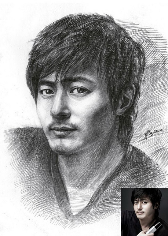Ngoài vẽ bằng bút bi, 9X còn thử nghiệm trong những bức tranh vẽ chân dung bằng bút chì. Bức tranh vẽ ngôi sao Hàn Quốc Jang Dong Gun.