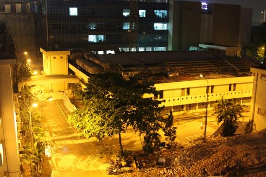 Toàn cảnh tòa nhà đang phá dỡ phát sinh đám cháy nhỏ chiều nay. Tính đến 18h30, mọi hoạt động sản xuất, tác nghiệp đã trở lại bình thường.