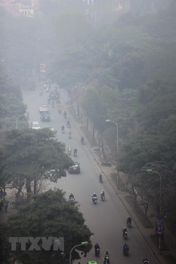 Phố Lê Thánh Tông quân Hoàn Kiếm chìm trong làn sương bụi mờ ảo. (Ảnh: Trọng Đạt/TTXVN).