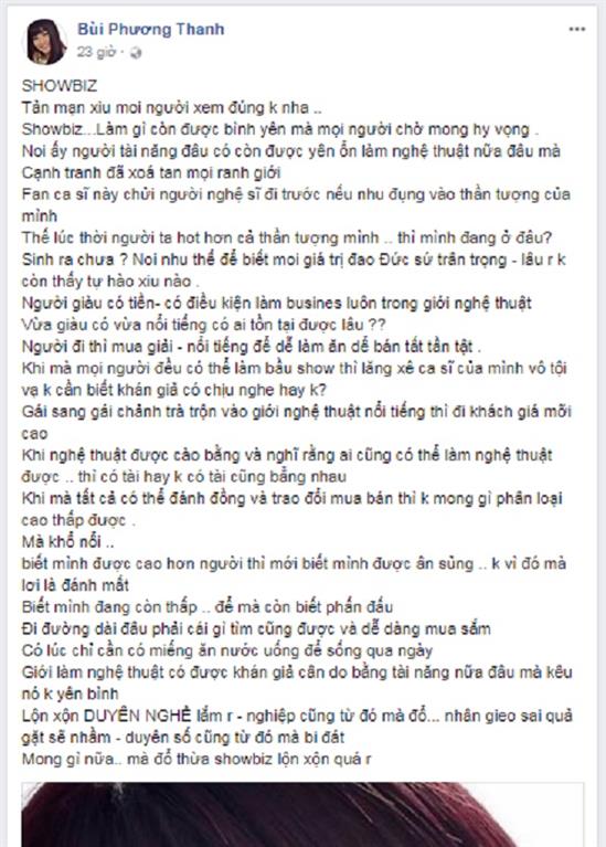 Trên facebook cá nhân của mình, nữ ca sĩ Phương Thanh đã có một chia sẻ về thực trạng của showbiz Việt hiện nay khiến cho nhiều người quan tâm. Trong đăng tải của mình, Phương  Thanh đã không ngần ngại bày tỏ quan điểm của mình về các góc khuất của giới nghệ thuật mà từ lâu nó chỉ như một điều bí ẩn đối với khán giả. Những tâm sự quá thật của Phương Thanh khiến cho nhiều người phát "sốc".