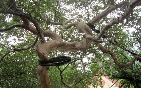 Cây ổi kỳ lạ này được gọi là “Ổi tàu”, khoảng gần 100 tuổi, thuộc sở hữu của cụ ông Lê Tự Sâm (93 tuổi, xóm Văn Minh, xã Thạch Tân, TP. Hà Tĩnh). Vì cây ổi vừa quý vừa hiếm, thế đẹp nên đã có người trả giá 150 triệu nhưng chủ nhân không có nhu cầu bán.