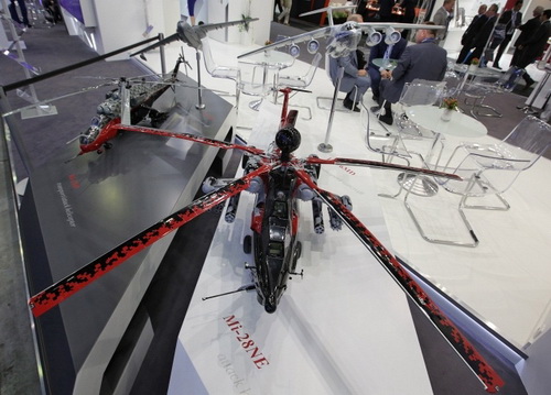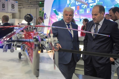 Hai quan chức Nga bên cạnh mô hình trực thăng tấn công Mi-28NE