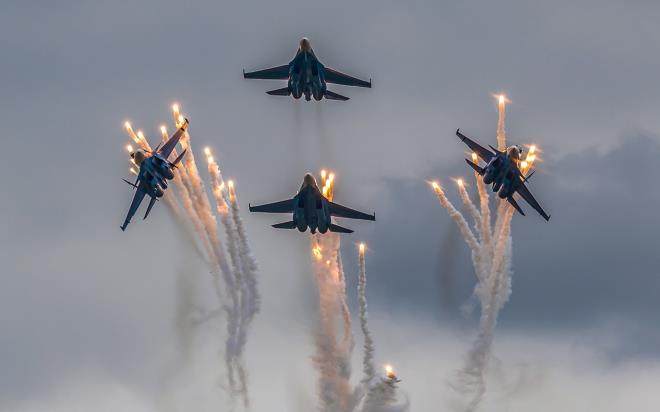 Đội bay Su-30SM của Nga thể hiện màn tấn công hiệp đồng trên không.