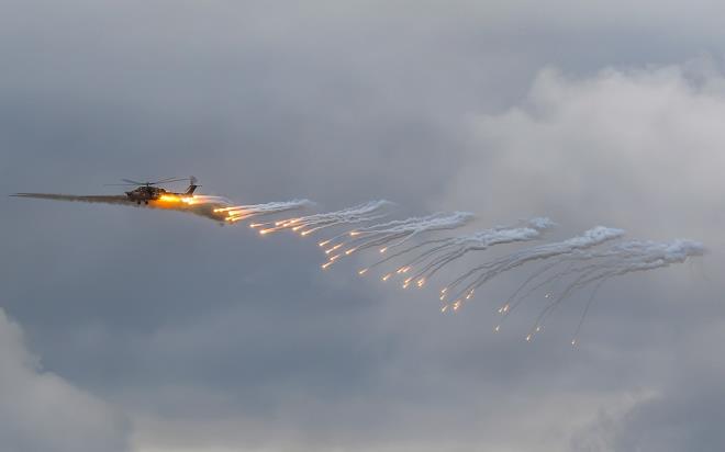 Sau đó Ka-52 thực hiện màn bắn pháo sáng đầy uy lực.