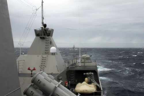 Cuộc tuần tra chung bắt đầu, cận cảnh là HQ-012, tiếp sau là HQ-011; phía xa chếch về bên phải hình là hai tàu của Trung Quốc