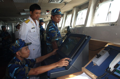 Sau cuộc tuần tra, biên đội tàu của Hải quân Việt Nam bắt đầu tiến vào lãnh hải Trung Quốc. Trong ảnh: Thiếu tá Nguyễn Đình Giảng - Thuyền trưởng HQ-011 - đang chỉ huy tổ lái điều khiển tàu vào cảng Trạm Giang