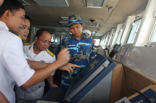 Hoa tiêu Trung Quốc (thứ hai từ trái) đang cung cấp thông tin về cảng Trạm Giang cho thuyền trưởng Nguyễn Đình Giảng và tổ lái tàu HQ-011