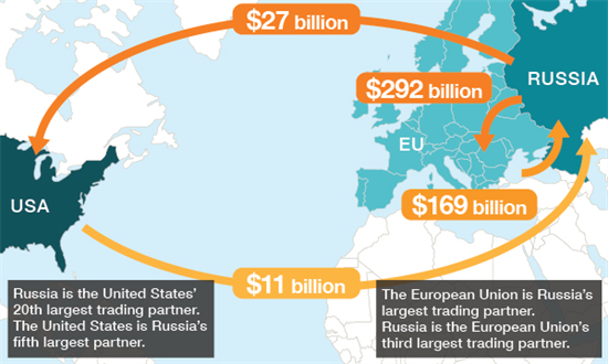 Riêng với Liên minh châu Âu, thị trường xuất khẩu sang Nga của khối này lớn hơn thị trường xuất khẩu hàng của họ vào Mỹ, nhiều công ty dầu của châu Âu có phần hùn rất lớn với Tổ hợp Dầu khí của Nga. Pháp không hề muốn hợp đồng cung cấp tàu chiếu Mistral cho Nga bị đình chỉ vì sợ đe dọa trực tiếp đến công ăn việc làm của 1.000 nhân viên đóng tàu. Một yếu tố khác cũng được nhắc đến: thị trường châu Âu là thị trường các đại gia Nga đang bỏ những khoản tiền khổng lồ vào đầu tư ở nhiều lĩnh vực khác nhau, chẳng hạn như tiền họ đầu tư vào địa ốc nhiều đến mức người dân thủ đô Anh nói đùa với nhau rằng tư bản Nga muốn biến London thành “Londongrad”.