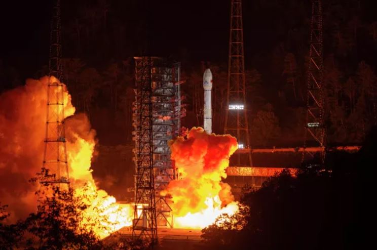 Tên lửa đẩy Long March-3B Y110 mang theo tàu thăm dò Tianwen-2 của Trung Quốc cất cánh từ Trung tâm Phóng Vệ tinh Tây Xương ở tỉnh Tứ Xuyên, Trung Quốc. © Getty Images / VCG