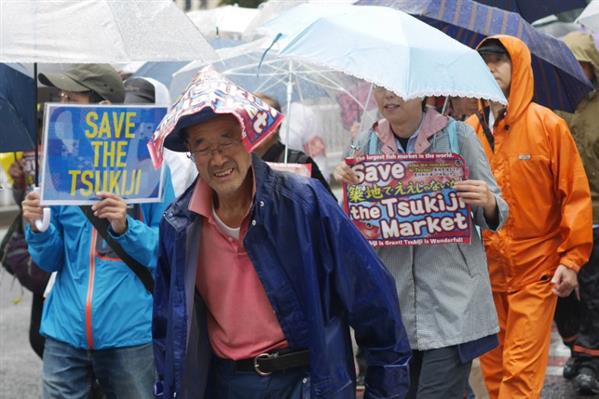 Cho tới ngày cuối cùng hoạt động của Tsukiji, nhiều người vẫn phản đối quyết định đóng cửa chợ cá 83 năm tuổi này của chính quyền thành phố Tokyo. Ảnh: AFP.
