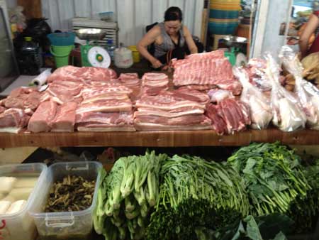 Ngoài rau, chị Hương còn bán kèm thịt lợn, thậm chí những phiên chợ có cả thịt chó. Thịt lợn cũng do người Việt nuôi ở các trang trại dưới quê, mổ và làm sạch sau đó bảo quản đưa lên chợ bán. Theo lời chị Hương, riêng thịt chó, đôi khi có hàng từ Việt Nam được vận chuyển qua đường hàng không, nhưng thi thoảng cũng có hàng ở Nga. Người Việt vẫn chuộng thịt chó ta, nên giá tiền thịt chó ta thường đắt gấp đôi chó tây.