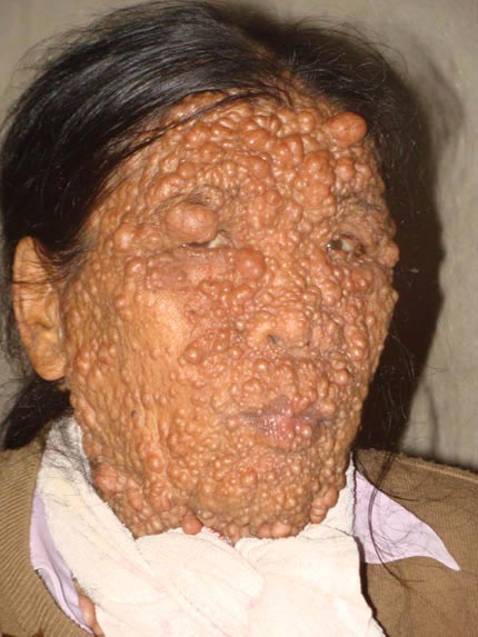 Có trường hợp khác bệnh nhân cũng “mọc sung” khắp cơ thể nhưng những ụ nhỏ không có màu đen, đó là trường hợp của bà Đáng ở Lục Bình, Hà Nam. Toàn thân bà nổi những khối u và cục to tròn mọc khắp cơ thể, khiến nhiều người thương tâm nhưng cũng có nhiều người cảm thấy rùng mình không dám nhìn.