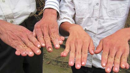 Bệnh bàn tay 6 ngón xuất hiện nhiều ở xã Thanh Tùng, huyện Thanh Chương, Nghệ An. Người dân nơi đây quen gọi là bệnh “trết”. Thông thường người mang bệnh mọc thêm ngón tay thứ 6, hay các ngón tay dính liền với nhau bằng lớp màng như chân vịt. Những cục thịt thừa này sẽ phát triển theo tuổi đời, càng lớn lên nó càng to.