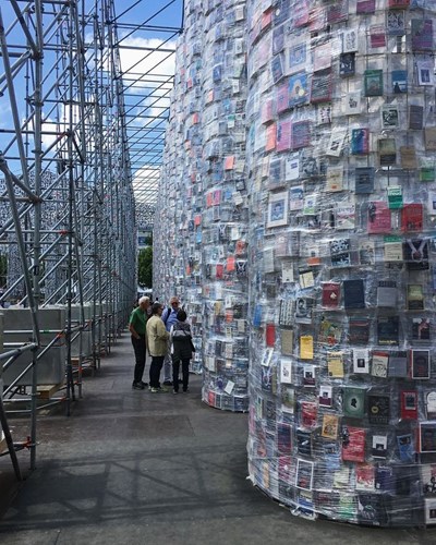Hàng trăm nghìn cuốn sách cấm không sử dụng đến sau khi thu thập đã được bọc bằng giấy bóng dẻo để "trang trí" cho công trình độc nhất vô nhị này.