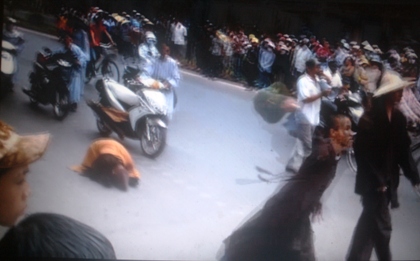 Khi một người dân vô tình đi băng qua trước đoàn, một tiểu sư thày đội mũ cối bất ngờ lao lên “phi thân tung chưởng”. Cú đạp hụt khiến vị tiểu sư thày chưa hết tức tối nên giật luôn chiếc mũ cối trên đầu ném thẳng vào người dân vừa vô tình “phạm húy”. Sau hành động côn đồ phản cảm khiến nhiều người dân bất bình, vị tiểu sư thày xắn tay áo với vẻ mặt thách thức rồi thản nhiên cầm lại chiếc mũ cối.