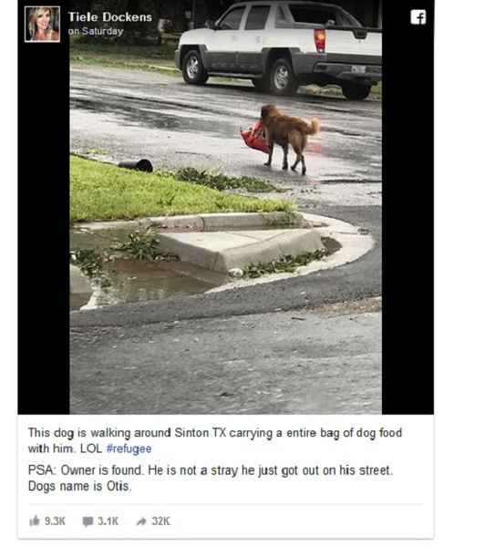 Tối ngày 26/8 (giờ địa phương), tài khoản Facebook có tên Tiele Dockens đăng tải hình ảnh một chú chó đang lầm lũi ngoạm túi lương thực đi trên đường phố khiến mạng xã hội xôn xao. Điều đặc biệt là hình ảnh này xuất hiện chỉ vài giờ trước khi siêu bão Harvey đổ bộ vào bang Texas, Mỹ.