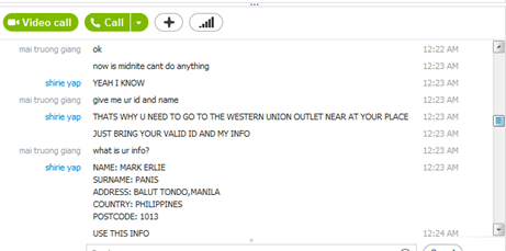Và sau một loạt các thương lượng thì cô ấy cũng đã chấp nhận mức giá 2000USD phải được chuyển tới một người ở Philipin thông qua Western Union  trước trưa ngày mai, một hoạt động được xem rất là tinh vi mà anh đã rơi vào bẫy.