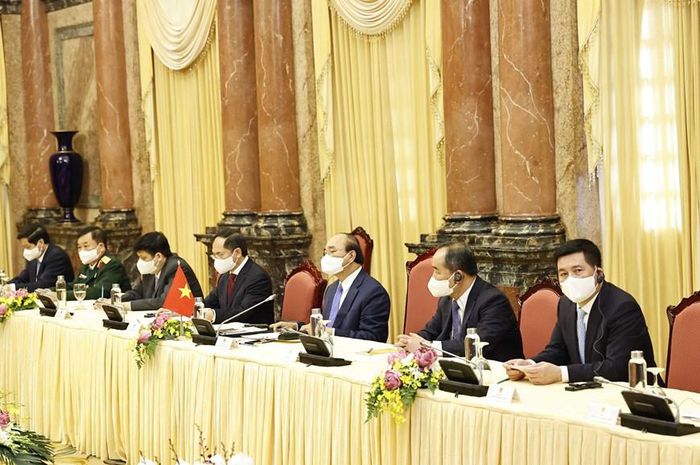 Chủ tịch nước Nguyễn Xuân Phúc tại buổi tiếp Phó Tổng thống Hoa Kỳ Kamala Harris. (Ảnh: Thống Nhất/TTXVN)