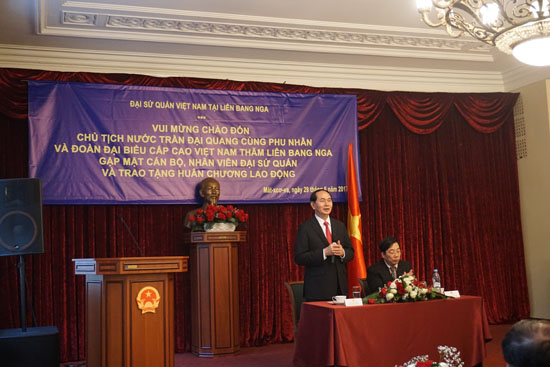 Chủ tịch Trần Đại Quang đánh giá cao các cơ quan Ngoại giao Việt Nam tại LB Nga với lực lượng nòng cốt là Đại sứ quán và cả một cộng đồng người Việt khá mạnh, đoàn kết và luôn hướng về Tổ Quốc.