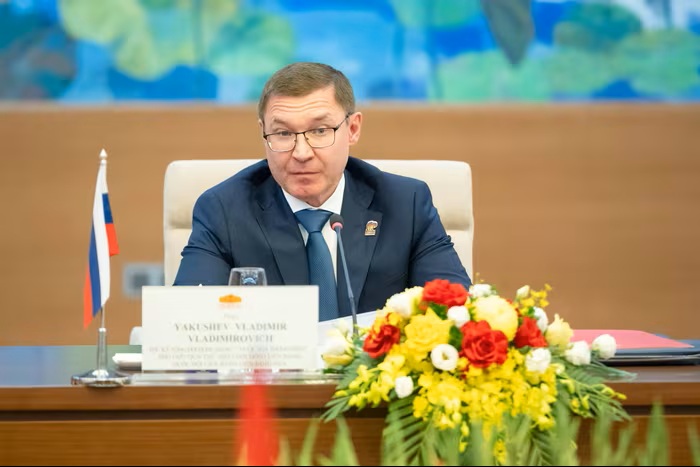 Bí thư Đại hội đồng Đảng Chính trị nước Nga thống nhất, Phó Chủ tịch thứ nhất Hội đồng Liên bang Nga, Quốc hội Liên bang Nga Vladimir Vladimirovich Yakushev phát biểu tại cuộc tiếp.