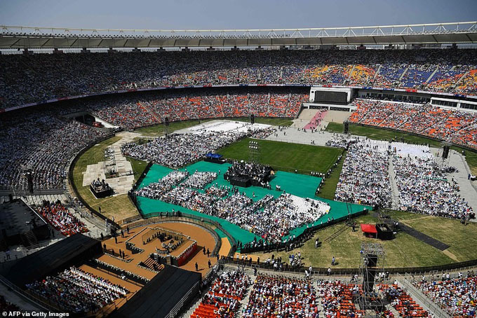 Sân vận động chật kín người theo dõi bài phát biểu của hai nhà lãnh đạo. Tại đây, ông Donald Trump có bài phát biểu về quan hệ song phương Mỹ - Ấn Độ,  Ảnh: AFP/Getty.