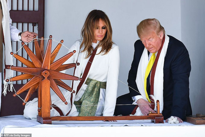 Trong 3 giờ có mặt tại bang Ahmedabad, quê hương của ông Modi, Tổng thống Mỹ cùng phu nhân đã đến thăm nhà của lãnh tụ Mahatma Gandhi. Ảnh: AP