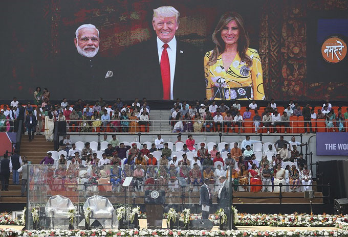 Tổng thống Mỹ Donald Trump và Phu nhân Melania Trump cùng Thủ tướng Ấn Độ Narendra Modi dự sự kiện chào đón tại sân vận động Sardar Patel, thành phố Ahmedabad trong chuyến thăm chính thức Ấn Độ của nhà lãnh đạo Mỹ. Ảnh: AP.