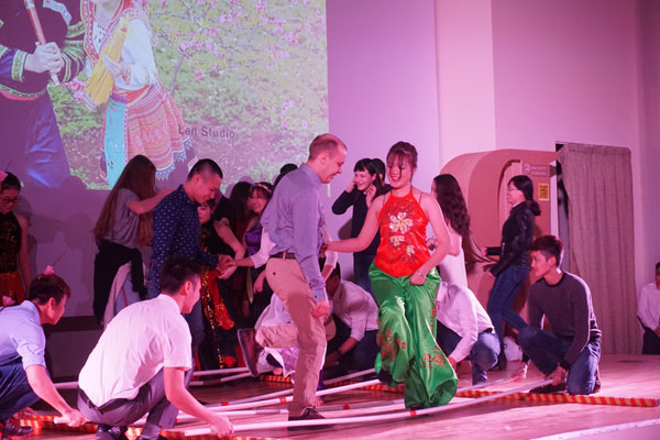 Tham gia tiết mục múa sạp với các bạn sinh viên Việt Nam.