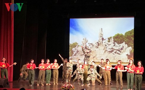 Trong chương trình nghệ thuật “Hát mãi khúc quân hành”, nhiều bài hát, điệu múa ca ngợi Đảng, ca ngợi hình tượng người lính và quê hương đất nước đã được các bạn lưu học sinh, sinh viên Việt Nam thể hiện sôi nổi, hấp dẫn.