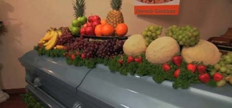Trên nắp quan tài người quá cố cũng có "mâm ngũ quả" theo truyền thống người Việt.