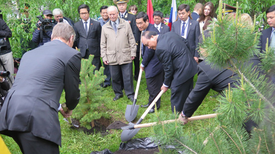 Thủ tướng cùng Chủ tịch Hội Hữu nghị Nga - Việt và Chủ tịch Hội cựu chuyên gia quân sự Nga từng công tác tại VN trong cây thông lưu niệm trong khuôn viên tượng đài HCM ở thủ đô Moskva