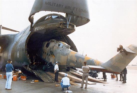 Đưa Mi-25 vào trong khoang máy bay C-5 Galaxy - Ảnh: Quân đội Mỹ