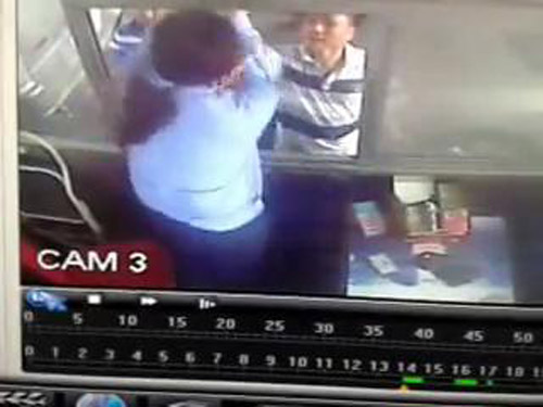 ... đạp túi bụi vào người nữ nhân viên bán vé.