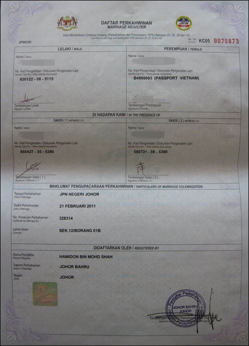 Giấy đăng ký kết hôn của Thu - Kim ở nước ngoài