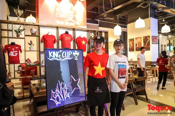 Nhân viên phục vụ cũng mặc áo cờ đỏ sao vàng để hòa cùng bầu không khí sôi động này
