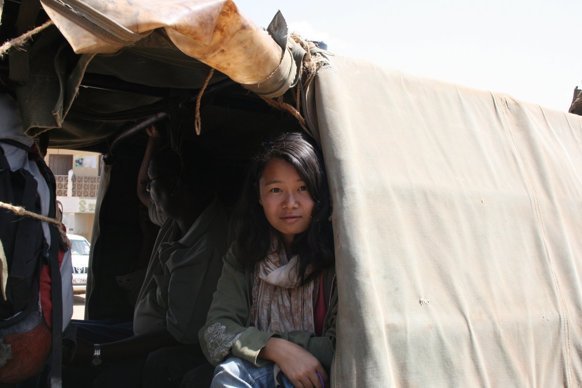 Trong hành trình của mình, Huyền đã được rất nhiều người tốt bụng cho đi nhờ xe. Trong hình là lúc cô xin quá giang từ Ethiopia qua Kenya, trên một trong những con đường nguy hiểm nhất ở Châu Phi.