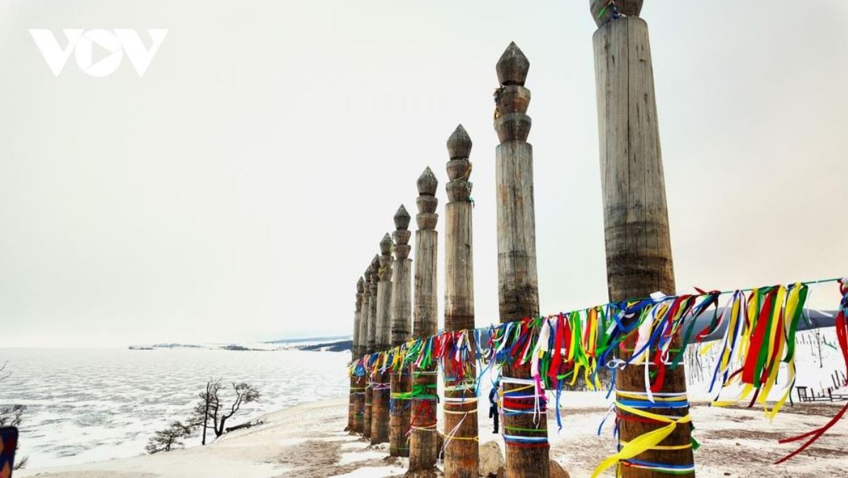 Trên đảo Olkhon, gần mũi đá Shaman, các trụ gỗ thiêng đứng lặng trước gió, tượng trưng