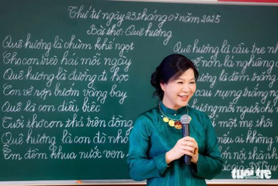 Phu nhân Ngô Phương Ly tươi cười khi đứng trên bục giảng trong lớp học tiếng Việt tại INCENTRA - Ảnh: NGUYỄN KHÁNH