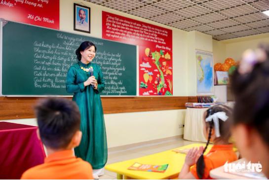 Phu nhân Ngô Phương Ly chia sẻ với các em học sinh là con cháu của bà con người Việt tại Nga trong lớp học tiếng Việt ở INCENTRA - Ảnh: NGUYỄN KHÁNH